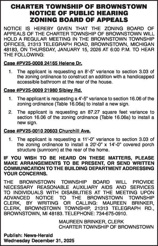 CHARTER TOWNSHIP OF BROWNSTOWN NOTICE OF PUBLIC HEARING ZONING BOARD OF APPEALS NOTICE IS HEREBY GIVEN THAT THE ZONING BOARD OF APPEALS OF THE CHARTER TOWNSHIP OF BROWNSTOWN WILL HOLD A REGULAR MEETING IN THE BROWNSTOWN TOWNSHIP OFFICES, 21313 TELEGRAPH ROAD, BROWNSTOWN, MICHIGAN 48183, ON THURSDAY, JANUARY 15, 2026 AT 6:00 P.M. TO HEAR THE FOLLOWING: Case #PV25-0008 24165 Helene Dr. 1. The applicant is requesting an 8’-5” variance to section 3.03 of the zoning ordinance to construct an addition with a handicapped accessible bathroom at the rear of the house. Case #PV25-0009 21980 Sibley Rd. 1. The applicant is requesting a 4’-5” variance to section 16.06 of the zoning ordinance (Table 16.06a) to install a new sign. 2. The applicant is requesting an 87.27 square feet variance to section 16.06 of the zoning ordinance (Table 16.06a) to install a new sign. Case #PV25-0010 20603 Churchill Ave. 1. The applicant is requesting a 11’-0” variance to section 3.03 of the zoning ordinance to install a 20’-0” x 14’-0” covered porch structure (sunroom) at the rear of the home. IF YOU WISH TO BE HEARD ON THESE MATTERS, PLEASE MAKE ARRANGEMENTS TO BE PRESENT, OR SEND WRITTEN COMMUNICATION TO THE BUILDING DEPARTMENT ADDRESSING YOUR CONCERNS. THE BROWNSTOWN TOWNSHIP BOARD WILL PROVIDE NECESSARY REASONABLE AUXILIARY AIDS AND SERVICES TO INDIVIDUALS WITH DISABILITIES AT THE MEETING UPON ADVANCED NOTICE TO THE BROWNSTOWN TOWNSHIP CLERK, BY WRITING OR CALLING: MAUREEN BRINKER, CLERK, BROWNSTOWN TOWNSHIP, 21313 TELEGRAPH RD., BROWNSTOWN, MI 48183. TELEPHONE: 734-675-0910. MAUREEN BRINKER, CLERK CHARTER TOWNSHIP OF BROWNSTOWN Publish: News-Herald Wednesday December 31, 2025