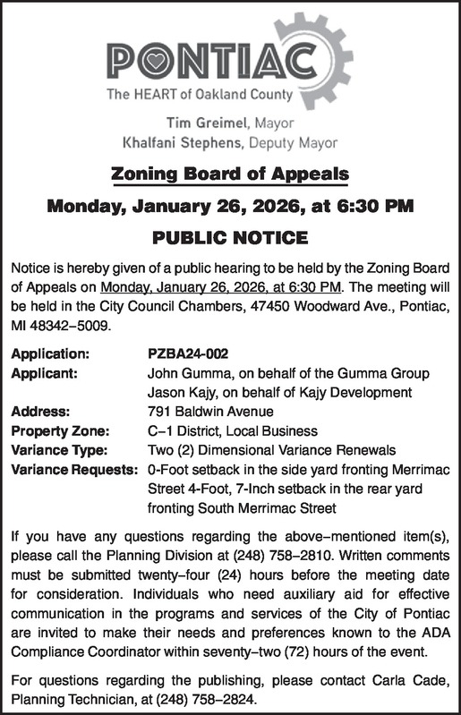 Zoning Board of Appeals Monday, January 19, 2026, at 6:30 PM PUBLIC NOTICE Notice is hereby given of a public hearing to be held by the Zoning Board of Appeals on Monday, January 19, 2026, at 6:30 PM. The meeting will be held in the City Council Chambers, 47450 Woodward Ave., Pontiac, MI 48342−5009. Application: Applicant: Address: Property Zone: Variance Type: Variance Requests: PZBA24-002 John Gumma, on behalf of the Gumma Group Jason Kajy, on behalf of Kajy Development 791 Baldwin Avenue C−1 District, Local Business Two (2) Dimensional Variance Renewals 0-Foot setback in the side yard fronting Merrimac Street 4-Foot, 7-Inch setback in the rear yard fronting South Merrimac Street If you have any questions regarding the above−mentioned item(s), please call the Planning Division at (248) 758−2810. Written comments must be submitted twenty−four (24) hours before the meeting date for consideration. Individuals who need auxiliary aid for effective communication in the programs and services of the City of Pontiac are invited to make their needs and preferences known to the ADA Compliance Coordinator within seventy−two (72) hours of the event. For questions regarding the publishing, please contact Carla Cade, Planning Technician, at (248) 758−2824.