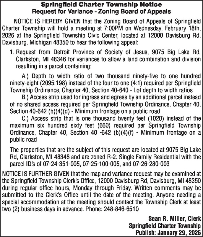 Springfield Charter Township Notice Request for Variance - Zoning Board of Appeals NOTICE IS HEREBY GIVEN that the Zoning Board of Appeals of Springfield Charter Township will hold a meeting at 7:00PM on Wednesday, February 18th, 2026 at the Springfield Township Civic Center, located at 12000 Davisburg Rd, Davisburg, Michigan 48350 to hear the following appeal: 1 . Request from Detroit Province of Society of Jesus, 9075 Big Lake Rd, Clarkston, MI 48346 for variances to allow a land combination and division resulting in a parcel containing: A.) Depth to width ratio of two thousand ninety-five to one hundred ninety-eight (2095:198) instead of the four to one (4:1) required per Springfield Township Ordinance, Chapter 40, Section 40-640 - Lot depth to width ratios B.) Access strip used for ingress and egress by an additional parcel instead of no shared access required per Springfield Township Ordinance, Chapter 40, Section 40-642 (b)(4)(d) - Minimum frontage on a public road C.) Access strip that is one thousand twenty feet (1020) instead of the maximum six hundred sixty feet (660) required per Springfield Township Ordinance, Chapter 40, Section 40 -642 (b)(4)(f) - Minimum frontage on a public road The properties that are the subject of this request are located at 9075 Big Lake Rd, Clarkston, MI 48346 and are zoned R-2: Single Family Residential with the parcel ID's of 07-24-351¬005, 07-25-100-005, and 07-26-280-003 NOTICE IS FURTHER GIVEN that the map and variance request may be examined at the Springfield Township Clerk's Office, 12000 Davisburg Rd, Davisburg, MI 48350 during regular office hours, Monday through Friday. Written comments may be submitted to the Clerk's Office until the date of the meeting. Anyone needing a special accommodation at the meeting should contact the Township Clerk at least two (2) business days in advance. Phone: 248-846-6510 Sean R. Miller, Clerk Springfield Charter Township Publish: January 29, 2026