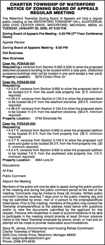 CHARTER TOWNSHIP OF WATERFORD NOTICE OF ZONING BOARD OF APPEALS REGULAR MEETING The Waterford Township Zoning Board of Appeals will hold a regular public meeting at the WATERFORD TOWNSHIP HALL AUDITORIUM, 5200 CIVIC CENTER DRIVE, WATERFORD, MICHIGAN, 48329, on TUESDAY, JANUARY 20, 2026, AT 6:00 P.M. Zoning Board of Appeals Pre-Meeting - 5:30 PM (3RD Floor Conference Room) Agenda Review Zoning Board of Appeals Meeting - 6:00 PM Old Business New Business Case No. PZBA26-001 Requesting a variance from Section 3-302.3.A(6) to allow the proposed detached accessory building to be located within a side yard. (Detached accessory buildings shall not be located in any yard except a rear yard) Property Location: 5676 Clinton River Dr Case No. PZBA26-002 Requesting: 1. A 5.0 ft. variance from Section 3-900 to allow the proposed deck to be located 0.0 ft. from the south side property line. (5 ft. minimum required) 2. A 33.0 ft. variance from Section 2-104.3 to allow the proposed deck to be located 26.0 ft. from the lakefront shoreline. (59.0 ft. minimum required) 3. A 48.0 ft. variance from Section 2-104.3 to allow the proposed stairs to be located 11.0 ft. from the lakefront shoreline. (59.0 ft. minimum required) Property Location: 2740 Silverside Rd Case No. PZBA26-003 Requesting: 1. A 3.7 ft. variance from Section 3-900 to allow the proposed addition to be located 31.3 ft. from the front property line. (35 ft. minimum required) 2. A 2.7 ft. variance from Section 2-104.2 to allow the proposed roof eave and gutter to be located 29.3 ft. from the front property line. (32 ft. minimum required) 3. A 2.4 ft. variance from Section 3-900 to allow the proposed addition to be located 7.6 ft. from the southwest side property line. (10 ft. minimum required) Property Location: 4964 Lore Dr Discussions All Else Public Comment Adjourn the Meeting Members of the public will only be able to speak during the public portion of the meeting and during the public comment period at the end of the meeting. Comments may be limited to three (3) minutes. Written public comment must be received 7 days prior to the public meeting day and may be submitted by email, mail or in person to the employee/official listed below. Prior to the meeting, members of the public may contact the Township employee/official at the address listed below with questions and/or to view the documents submitted by the applicant for this request. Persons with disabilities in need of accommodations to be able to participate in the meeting should provide at least 24-hour advance notice to the listed Township employee by phone, email, or mail and an attempt will be made to provide reasonable accommodations. Stacy St. James, Environmental and Housing Rehab Coordinator Charter Township of Waterford 5200 Civic Center Drive, Waterford, Michigan 48329 Email: sstjames@waterfordmi.gov Phone: (248) 674-6240
