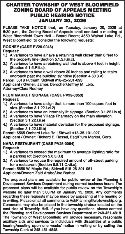 CHARTER TOWNSHIP OF WEST BLOOMFIELD ZONING BOARD OF APPEALS MEETING PUBLIC HEARING NOTICE JANUARY 20, 2026 PLEASE TAKE NOTICE that on January 20, 2026, at 5:30 p.m., the Zoning Board of Appeals shall conduct a meeting at West Bloomfield Town Hall – Board Room; 4550 Walnut Lake Rd., West Bloomfield, to consider the following requests: RODNEY (CASE PV25-0046) Request: 1.) A variance to have a have a retaining wall closer than 8 feet to the property line (Section 5.1.5.F.iii.c). 2.) A variance to have a retaining wall that is above 4 feet in height (Section 5.1.5.F.iii.d). 3.) A variance to have a wall above 30 inches and railing to stairs encroach past the building sightline (Section 4.50.3.A). Parcel: 5618 Putnam; Sidwell #18-25-201-093 Applicant / Owner: James Derocher/ Jeffrey M. Leib, Attorney/Clara Rodney PLUM MARKET SIGNAGE (CASE PV25-0053) Request: 1.) A variance to have a sign that is more than 100 square feet in size. (Section 3.1.22.I.vi.2) 2.) A variance to have an internally lit signage. (Section 3.1.22.I.iv.a) 3.) A variance to have Village Pharmacy on the main elevation. (Section 3.1.22.I.ii.e) 4.) A variance to have material deviation for the proposed signage. (Section 3.1.22.I.iii.b) Parcel: 6565 Orchard Lake Rd.; Sidwell #18-35-101-027 Applicant / Owner: Richard E. Rassel, Esq/Plum Market, Corp. NARA RESTAURANT (CASE PV25-0054) Request: 1.) A variance to exceed the maximum to average lighting ratio for a parking lot (Section 5.6.3.B.i) 2.) A variance to reduce the required amount of off-street parking for a restaurant (Section 5.8.11.C.vii.a). Parcel: 5656 W. Maple Rd.; Sidwell #18-26-301-051 Applicant / Owner: Zaid Arabo/Joe Barbat The proposed plans are available for public review at the Planning & Development Services Department during normal business hours. The proposed plans will be available for public review on the Township’s website no later than 5:00PM on January 15, 2026. Any comments regarding these requests may be made by appearing at the hearing or in writing. Please email all comments to AskPlanning@wbtownship.org. Comments may also be placed in the township drobox located on the east side of Township Hall. If you have any questions, please contact the Planning and Development Services Department at 248-451-4818. The Township of West Bloomfield will provide necessary, reasonable auxiliary aids and services to individuals with disabilities at