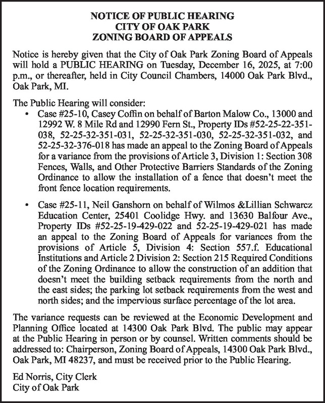 NOTICE OF PUBLIC HEARING CITY OF OAK PARK ZONING BOARD OF APPEALS Notice is hereby given that the City of Oak Park Zoning Board of Appeals will hold a PUBLIC HEARING on Tuesday, December 16, 2025, at 7:00 p.m., or thereafter, held in City Council Chambers, 14000 Oak Park Blvd., Oak Park, MI. The Public Hearing will consider: • Case #25-10, Casey Coffin on behalf of Barton Malow Co., 13000 and 12992 W. 8 Mile Rd and 12990 Fern St., Property IDs #52-25-22-351-038, 52-25-32-351-031, 52-25-32-351-030, 52-25-32-351-032, and 52-25-32-376-018 has made an appeal to the Zoning Board of Appeals for a variance from the provisions of Article 3, Division 1: Section 308 Fences, Walls, and Other Protective Barriers Standards of the Zoning Ordinance to allow the installation of a fence that doesn’t meet the front fence location requirements. • Case #25-11, Neil Ganshorn on behalf of Wilmos &Lillian Schwarcz Education Center, 25401 Coolidge Hwy. and 13630 Balfour Ave., Property IDs #52-25-19-429-022 and 52-25-19-429-021 has made an appeal to the Zoning Board of Appeals for variances from the provisions of Article 5, Division 4: Section 557.f. Educational Institutions and Article 2 Division 2: Section 215 Required Conditions of the Zoning Ordinance to allow the construction of an addition that doesn’t meet the building setback requirements from the north and the east sides; the parking lot setback requirements from the west and north sides; and the impervious surface percentage of the lot area. The variance requests can be reviewed at the Economic Development and Planning Office located at 14300 Oak Park Blvd. The public may appear at the Public Hearing in person or by counsel. Written comments should be addressed to: Chairperson, Zoning Board of Appeals, 14300 Oak Park Blvd., Oak Park, MI 48237, and must be received prior to the Public Hearing. Ed Norris, City Clerk City of Oak Park