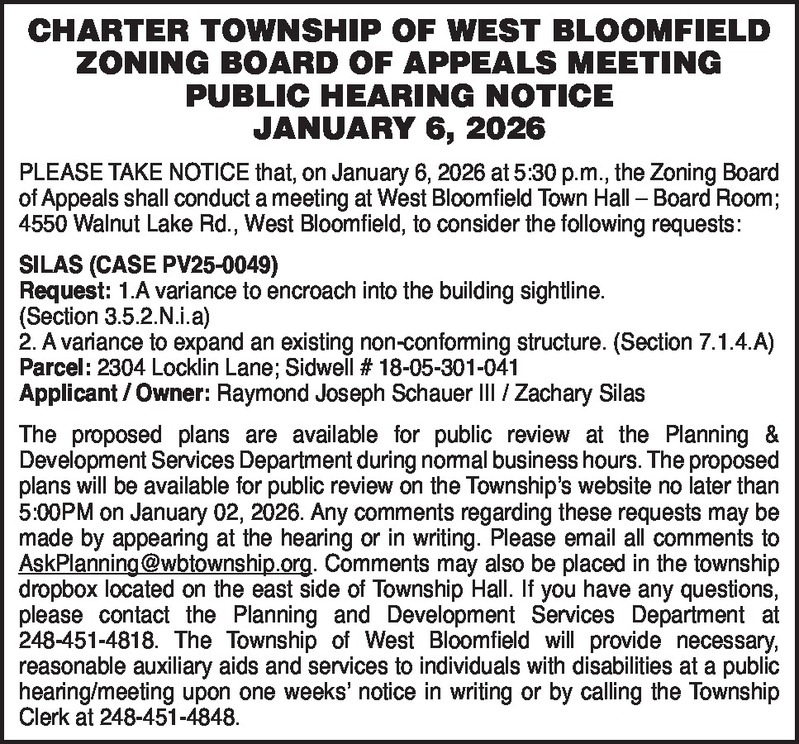 CHARTER TOWNSHIP OF WEST BLOOMFIELD ZONING BOARD OF APPEALS MEETING PUBLIC HEARING NOTICE JANUARY 6, 2026 PLEASE TAKE NOTICE that, on January 6, 2026 at 5:30 p.m., the Zoning Board of Appeals shall conduct a meeting at West Bloomfield Town Hall – Board Room; 4550 Walnut Lake Rd., West Bloomfield, to consider the following requests: SILAS (CASE PV25-0049) Request: 1.A variance to encroach into the building sightline. (Section 3.5.2.N.i.a) 2. A variance to expand an existing non-conforming structure. (Section 7.1.4.A) Parcel: 2304 Locklin Lane; Sidwell # 18-05-301-041 Applicant / Owner: Raymond Joseph Schauer III / Zachary Silas The proposed plans are available for public review at the Planning & Development Services Department during normal business hours. The proposed plans will be available for public review on the Township’s website no later than 5:00PM on January 02, 2026. Any comments regarding these requests may be made by appearing at the hearing or in writing. Please email all comments to AskPlanning@wbtownship.org. Comments may also be placed in the township drobox located on the east side of Township Hall. If you have any questions, please contact the Planning and Development Services Department at 248-451-4818. The Township of West Bloomfield will provide necessary, reasonable auxiliary aids and services to individuals with disabilities at a public hearing/meeting upon one weeks’ notice in writing or by calling the Township Clerk at 248-451-4848.