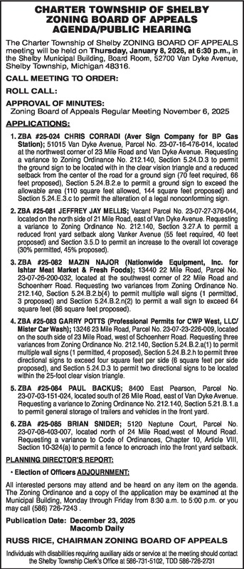 CHARTER TOWNSHIP OF SHELBY ZONING BOARD OF APPEALS AGENDA/PUBLIC HEARING The Charter Township of Shelby ZONING BOARD OF APPEALS meeting will be held on Thursday, January 8, 2026, at 6:30 p.m., in the Shelby Municipal Building, Board Room, 52700 Van Dyke Avenue, Shelby Township, Michigan 48316. CALL MEETING TO ORDER: ROLL CALL: APPROVAL OF MINUTES: Zoning Board of Appeals Regular Meeting November 6, 2025 APPLICATIONS: 1. ZBA # 25-024 CHRIS CORRADI (Aver Sign Company for BP Gas Station); 51015 Van Dyke Avenue, Parcel No. 23-07-16-476-014, located at the northwest corner of 23 Mile Road and Van Dyke Avenue. Requesting a variance to Zoning Ordinance No. 212.140, Section 5.24.D.3 to permit the ground sign to be located within the clear vision triangle and a reduced setback from the center of the road for a ground sign (70 feet required, 66 feet proposed), Section 5.24.B.2.e to permit a ground sign to exceed the allowable area (110 square feet allowed, 144 square feet proposed) and Section 5.24.E.3.c to permit the alteration of a legal nonconforming sign. 2. ZBA #25-081 JEFFREY JAY MELLIS; Vacant Parcel No. 23-07-27-376-044, located on the north side of 21 Mile Road, east of Van Dyke Avenue. Requesting a variance to Zoning Ordinance No. 212.140, Section 3.27.A to permit a reduced front yard setback along Vanker Avenue (55 feet required, 40 feet proposed) and Section 3.5.D to permit an increase to the overall lot coverage (30% permitted, 45% proposed). 3. ZBA #25-082 MAZIN NAJOR (Nationwide Equipment, Inc. for Ishtar Meat Market & Fresh Foods); 13440 22 Mile Road, Parcel No. 23-07-26-200-032, located at the southwest corner of 22 Mile Road and Schoenherr Road. Requesting two variances from Zoning Ordinance No. 212.140, Section 5.24.B.2.b(4) to permit multiple wall signs (1 permitted, 3 proposed) and Section 5.24.B.2.n(2) to permit a wall sign to exceed 64 square feet (86 square feet proposed). 4. ZBA #25-083 GARRY POTTS (Professional Permits for CWP West, LLC/Mister Car Wash); 13246 23 Mile Road, Parcel No. 23-07-23-226-009, located on the south side of 23 Mile Road, west of Schoenherr Road. Requesting three variances from Zoning Ordinance No. 212.140, Section 5.24.B.2.a(1) to permit multiple wall signs (1 permitted, 4 proposed), Section 5.24.B.2.h to permit three directional signs to exceed four square feet per side (6 square feet per side proposed), and Section 5.24.D.3 to permit two directional signs to be located within the 25-foot clear vision triangle. 5. ZBA #25-084 PAUL BACKUS; 8400 East Pearson, Parcel No. 23-07-03-151-024, located south of 26 Mile Road, east of Van Dyke Avenue. Requesting a variance to Zoning Ordinance No. 212.140, Section 5.21.B.1.a to permit general storage of trailers and vehicles in the front yard. 6. ZBA #25-085 BRIAN SNIDER; 5120 Neptune Court, Parcel No. 23-07-08-403-007, located north of 24 Mile Road, west of Mound Road. Requesting a variance to Code of Ordinances, Chapter 10, Article VIII, Section 10-324(a) to permit a fence to encroach into the front yard setback. PLANNING DIRECTOR’S REPORT: • Election of Officers ADJOURNMENT: All interested persons may attend and be heard on any item on the agenda. The Zoning Ordinance and a copy of the application may be examined at the Municipal Building, Monday through Friday from 8:30 a.m. to 5:00 p.m. or you may call (586) 726-7243. Publication Date: December 23, 2025 Macomb Daily RUSS RICE, CHAIRMAN ZONING BOARD OF APPEALS Individuals with disabilities requiring auxiliary aids or service at the meeting should contact the Shelby Township Clerk’s Office at 586-731-5102, TDD 586-726-2731