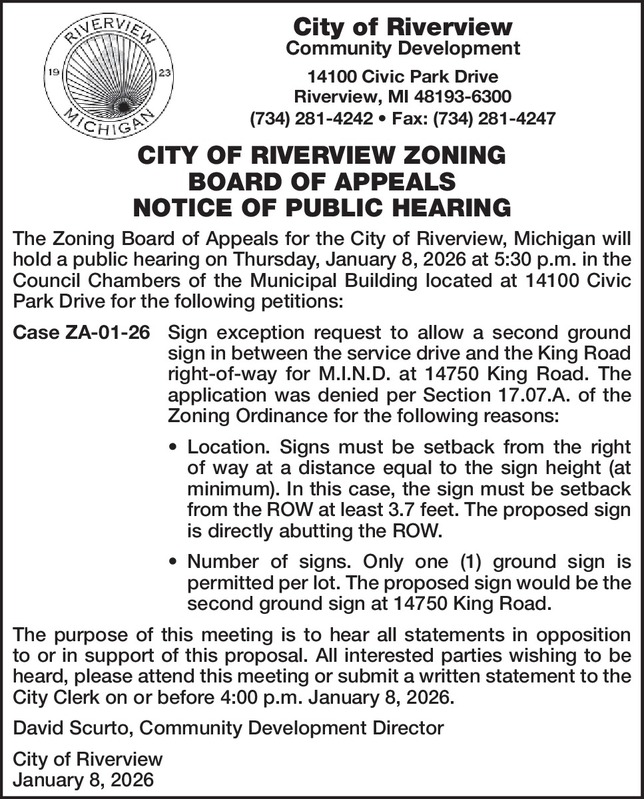 CITY OF RIVERVIEW ZONING BOARD OF APPEALS NOTICE OF PUBLIC HEARING The Zoning Board of Appeals for the City of Riverview, Michigan will hold a public hearing on Thursday, January 8, 2026 at 5:30 p.m. in the Council Chambers of the Municipal Building located at 14100 Civic Park Drive for the following petitions: Case ZA-01-26 Sign exception request to allow a second ground sign in between the service drive and the King Road right-of-way for M.I.N.D. at 14750 King Road. The application was denied per Section 17.07.A. of the Zoning Ordinance for the following reasons: • Location. Signs must be setback from the right of way at a distance equal to the sign height (at minimum). In this case, the sign must be setback from the ROW at least 3.7 feet. The proposed sign is directly abutting the ROW. • Number of signs. Only one (1) ground sign is permitted per lot. The proposed sign would be the second ground sign at 14750 King Road. The purpose of this meeting is to hear all statements in opposition to or in support of this proposal. All interested parties wishing to be heard, please attend this meeting or submit a written statement to the City Clerk on or before 4:00 p.m. January 8, 2026. David Scurto, Community Development Director City of Riverview January 8, 2026
