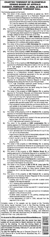 CHARTER TOWNSHIP OF BLOOMFIELD ZONING BOARD OF APPEALS TUESDAY, FEBRUARY 10, 2026, at 6:30 P.M. BLOOMFIED TOWNSHIP HALL The following appeals will be heard: 1P). The owner of the property identified as parcel no. 19-17-276-016 is seeking approval for a Permission Request and Dimensional Variance Requests for the following items: • An existing 6 ft. by 6 ft. by 8 ft. high shed located in the front yard, on a parcel without principle structure, and encroaching 15 ft. into the required 16 ft. southerly side yard setback. • A 4 ft. high black replacement chain link fence located in the easterly front yard and northerly and southerly side yards. 2P). The owner of the property at 3200 Devon Brook Dr. is seeking approval for a Permission Request to install a 24 ft. by 12 ft. by 7 ft. high dark grey shed located in the Telegraph Rd. secondary frontage, setback at least 16 feet from all lot lines. 3P). The owner of the property at 3894 Peabody Dr. seeking approval for a Permission Request and Dimensional Variance Request for a 60 ft. by 35 ft. sports court encroaching 14 ft. into the required 16 ft. southerly and easterly setback. 4P). The owner of the property at 4955 Stoneleigh Rd. is seeking approval for the following accessory structures located in the rear yard and setback back at least 16 ft. from all lot lines: A 30 ft. by 60 ft. sports court with 8 ft. netted fencing. 5P). The owner of the property at 42931 Woodward Ave. is seeking approval for Dimensional Variance Requests for Western Market proposed for the former Rite Aid space in the Woodward Square Shopping center for a proposed loading dock not meeting the required square footage and three (3) wall signs totaling 125 sq. ft. 1.) The owner of the property at 335 Waddington Rd. is seeking approval for a Permission Request to install a 13 ft. by 19 ft. by 10 ft. high pergola in the rear yard and 16 ft. from all property lines. 2.) The owner of the property at 5185 Longmeadow Rd. is seeking approval for a Dimensional Variance Request for existing ground-mounted mechanical equipment in the rear yard and more than 5 ft. from the principal structure. 3.) The owner of the property at 1200 Lone Pine Rd. is seeking approval for a Dimensional Variance Request to install the following fencing along the Hills of Lone Pine perimeter: • 6 ft. high ornamental aluminum picket fencing at three locations along the Echo Road frontage. • 6 ft. high galvanized chain link fence along the Cross of Christ Lutheran Church property line. 4.) The owner of the property at 2025 Quarton Rd. is seeking approval for Permission Requests and Dimensional Variance Requests to construct two accessory structures: • A 51 ft. by 31 ft. by 14 ft. high pool house located in the rear yard and located 16 ft. from all property lines. • An 18 ft. by 11 ft. by 11 ft. high greenhouse located in the easterly side yard and located 16 ft. from all property lines. • Pool equipment located inside the pool house and the mini split system to be located next to the accessory structure a dimensional variance is required since it is not immediately adjacent to the home. 5.) The owner of the property at 311 E. Bradford Rd. is seeking approval for Permission Requests and a Dimensional Variance Request for the following items: • A 60 ft. by 30 ft. sports court; located in the rear yard and set back at least 16 ft. from all lot lines. • A 25 ft. high wood fire place located in the rear yard and set back at least 16 ft. from all lot lines. • A 2 ft. high stone wall located in the front yard. 6.) The owner of the property at 5385 Longmeadow Rd. is seeking approval for Permission Requests and a Dimensional Variance Request to construct the following items, Section 23 & 24 Bloomfield Estates Subdivision Lot 32: • A 2 ft. tall stone wall in the front yard with two 3 ft. by 3 ft. by 3 ft. tall non-illuminated piers. • A gas fire pit in the rear yard not immediately adjacent to the patio, located 16 ft. from all property lines. • A 54 ft. by 29 ft. by 23 ft. high pool house exceeding the 14 ft. height limit to the chimney, located 16 ft. from all property lines. 7.) The owner of the property at 1356 Kirkway Rd. is seeking approval for a Dimensional Variance for an existing set of pool equipment to be located in the rear yard and 7 ft. away from the residential structure. 8.) The owner of the property at 3721 Shallow Brook Dr. is seeking approval for a Permission Request for an existing 17 ft. by 14 ft. by 12 ft. high canopy for kitchen equipment located in the rear yard and set back at least 16 ft. from all lot lines. 9.) The owner of the property at 1750 Saxon Dr. is seeking approval for a Dimensional Variance Request to install a generator in the front yard of Birmingham Country Club. 10.) The owner of the property at 880 & 970 W. Long Lake Rd. is seeking approval for a Dimensional Variance Request to construct a new building for Ross Animal Hospital that encroaches 134 ft. into the required 200 ft. residential district setback. Complete copies of the appeals can be viewed at the Township Hall during regular business hours in the Planning, Building, and Ordinance Department, from 7:00 a.m. to 5:30 p.m., Monday through Thursday. Comments may be provided at the public hearing or by writing to: Bloomfield Township Planning, Building, and Ordinance Department, P.O. Box 489, Bloomfield Hills, MI 48303-0489- Telephone: (248) 433-7795 - Fax: (248) 433-7729. Or via email to ZBA-publiccomment@bloomfieldtwp.org Written comment received after the packet has been posted will be provided to Board members for review prior to the meeting. To view the Zoning Board of Appeals packet posted on Documents on Demand by the end of business Thursday, February 5th, you can use the QR code to the right. To view the meeting live, go to Comcast Channel 15 or AT&T Channel 99 or via the internet: Bloomfield Twp, MI – Public Meetings