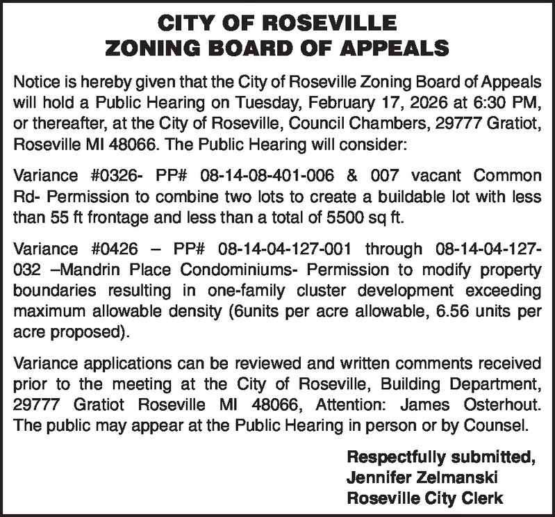 CITY OF ROSEVILLE ZONING BOARD OF APPEALS Notice is hereby given that the City of Roseville Zoning Board of Appeals will hold a Public Hearing on Tuesday, February 17, 2026 at 6:30 PM, or thereafter, at the City of Roseville, Council Chambers, 29777 Gratiot, Roseville MI 48066. The Public Hearing will consider: Variance #0326- PP# 08-14-08-401-006 & 007 vacant Common Rd- Permission to combine two lots to create a buildable lot with less than 55 ft frontage and less than a total of 5500 sq ft. Variance #0426 – PP# 08-14-04-127-001 through 08-14-04-127-032 –Mandrin Place Condominiums- Permission to modify property boundaries resulting in one-family cluster development exceeding maximum allowable density (6units per acre allowable, 6.56 units per acre proposed). Variance applications can be reviewed and written comments received prior to the meeting at the City of Roseville, Building Department, 29777 Gratiot Roseville MI 48066, Attention: James Osterhout. The public may appear at the Public Hearing in person or by Counsel. Respectfully submitted, Jennifer Zelmanski Roseville City Clerk