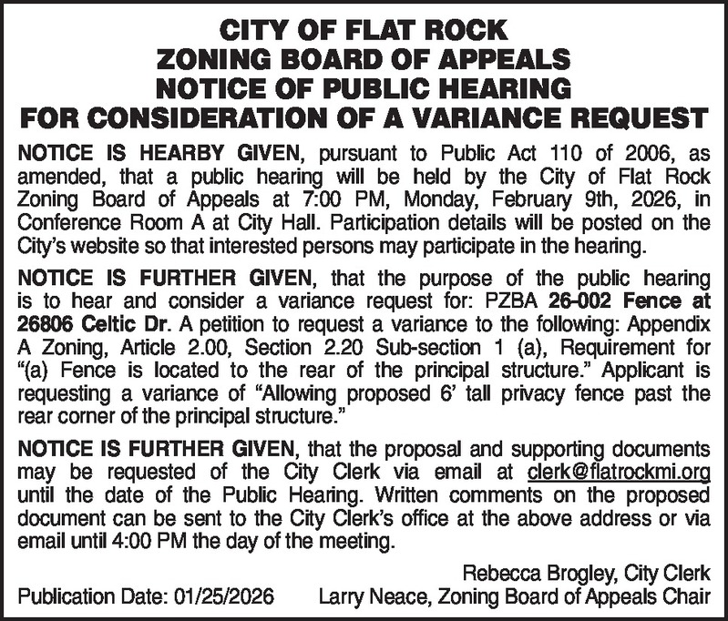 CITY OF FLAT ROCK ZONING BOARD OF APPEALS NOTICE OF PUBLIC HEARING FOR CONSIDERATION OF A VARIANCE REQUEST NOTICE IS HEARBY GIVEN, pursuant to Public Act 110 of 2006, as amended, that a public hearing will be held by the City of Flat Rock Zoning Board of Appeals at 7:00 PM, Monday, February 9th, 2026, in Conference Room A at City Hall. Participation details will be posted on the City’s website so that interested persons may participate in the hearing. NOTICE IS FURTHER GIVEN, that the purpose of the public hearing is to hear and consider a variance request for: PZBA 26-002 Fence at 26806 Celtic Dr. A petition to request a variance to the following: Appendix A Zoning, Article 2.00, Section 2.20 Sub-section 1 (a), Requirement for “(a) Fence is located to the rear of the principal structure.” Applicant is requesting a variance of “Allowing proposed 6’ tall privacy fence past the rear corner of the principal structure.” NOTICE IS FURTHER GIVEN, that the proposal and supporting documents may be requested of the City Clerk via email at clerk@flatrockmi.org until the date of the Public Hearing. Written comments on the proposed document can be sent to the City Clerk’s office at the above address or via email until 4:00 PM the day of the meeting. Rebecca Brogley, City Clerk Publication Date: 01/25/2026 Larry Neace