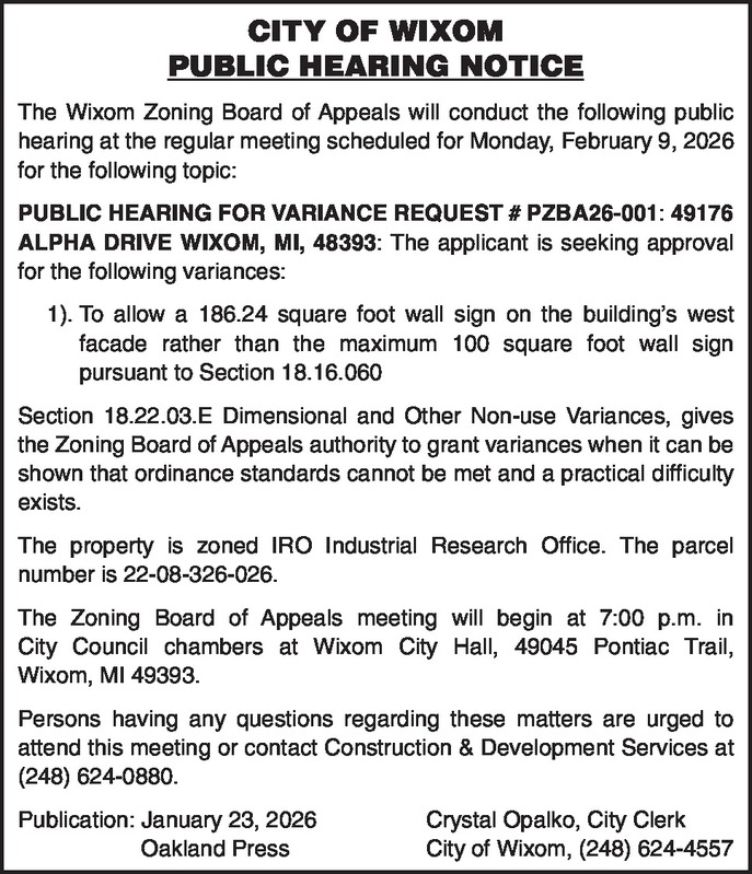 CITY OF WIXOM PUBLIC HEARING NOTICE The Wixom Zoning Board of Appeals will conduct the following public hearing at the regular meeting scheduled for Monday, February 9, 2026 for the following topic: PUBLIC HEARING FOR VARIANCE REQUEST # PZBA26-001: 49176 ALPHA DRIVE WIXOM, MI, 48393: The applicant is seeking approval for the following variances: 1) To allow a 186.24 sqaure foot wall sign on the building’s west facade rather than the maximum 100 square foot wall sign pursuant to Section 18.16.060 Section 18.22.03.E Dimensional and Other Non-use Variances, gives the Zoning Board of Appeals authority to grant variances when it can be shown that ordinance standards cannot be met and a practical difficulty exists. The property is zoned IRO Industrial Research Office. The parcel number is 22-08-326-026. The Zoning Board of Appeals meeting will begin at 7:00 p.m in City Council chambers at Wixom City Hall, 49045 Pontiac Trail, Wixom, MI 49393. Persons having any questions regarding these matters are urged to attend this meeting or contact Construction & Development Services at (248) 624-0880. Publication: January 23, 2026 Crystal Opalko, City Clerk Oakland Press City of Wixom, (248) 624-4557