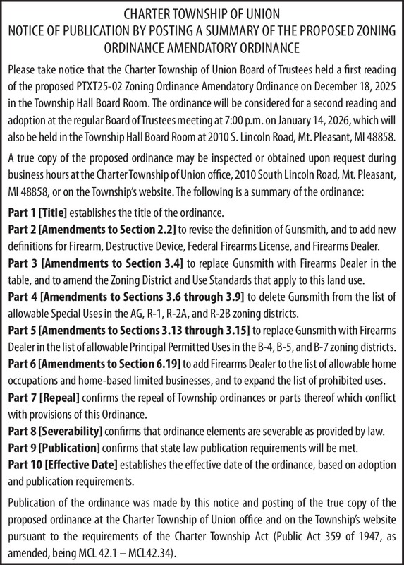 CHARTER TOWNSHIP OF UNION NOTICE OF PUBLICATION BY POSTING A SUMMARY OF THE PROPOSED ZONING ORDINANCE AMENDATORY ORDINANCE Please take notice that the Charter Township of Union Board of Trustees held a first reading of the proposed PTXT25-02 Zoning Ordinance Amendatory Ordinance on December 18, 2025 in the Township Hall Board Room. The ordinance will be considered for a second reading and adoption at the regular Board of Trustees meeting at 7:00 p.m. on January 14, 2026, which will also be held in the Township Hall Board Room at 2010 S. Lincoln Road, Mt. Pleasant, MI 48858. A true copy of the proposed ordinance may be inspected or obtained upon request during business hours at the Charter Township of Union office, 2010 South Lincoln Road, Mt. Pleasant, MI 48858, or on the Township’s website. The following is a summary of the ordinance: Part 1 [Title] establishes the title of the ordinance. Part 2 [Amendments to Section 2.2] to revise the definition of Gunsmith, and to add new definitions for Firearm, Destructive Device, Federal Firearms License, and Firearms Dealer. Part 3 [Amendments to Section 3.4] to replace Gunsmith with Firearms Dealer in the table, and to amend the Zoning District and Use Standards that apply to this land use. Part 4 [Amendments to Sections 3.6 through 3.9] to delete Gunsmith from the list of allowable Special Uses in the AG, R-1, R-2A, and R-2B zoning districts. Part 5 [Amendments to Sections 3.13 through 3.15] to replace Gunsmith with Firearms Dealer in the list of allowable Principal Permitted Uses in the B-4, B-5, and B-7 zoning districts. Part 6 [Amendments to Section 6.19] to add Firearms Dealer to the list of allowable home occupations and home-based limited businesses, and to expand the list of prohibited uses. Part 7 [Repeal] confirms the repeal of Township ordinances or parts thereof which conflict with provisions of this Ordinance. Part 8 [Severability] confirms that ordinance elements are severable as provided by law. Part 9 [Publication] confirms that state law publication requirements will be met. Part 10 [Effective Date] establishes the effective date of the ordinance, based on adoption and publication requirements. Publication of the ordinance was made by this notice and posting of the true copy of the proposed ordinance at the Charter Township of Union office and on the Township’s website pursuant to the requirements of the Charter Township Act (Public Act 359 of 1947, as amended, being MCL 42.1 – MCL42.34).