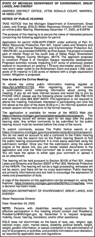STATE OF MICHIGAN DEPARTMENT OF ENVIRONMENT, GREAT LAKES, AND ENERGY WARREN DISTRICT OFFICE, 27700 DONALD COURT, WARREN, MI 48092-2793 NOTICE OF PUBLIC HEARING TAKE NOTICE that the Michigan Department of Environment, Great Lakes, and Energy, (EGLE) Water Resources Division (WRD) will hold an online public hearing, Wednesday December 17, 2025, at 6:00PM. The purpose of this hearing is to secure the views of interested persons concerning the following application for permit: Application for permit HQB-AVPF-P393Y under authority of Part 31, Water Resources Protection; Part 301, Inland Lakes and Streams and Part 303, of the Natural Resources and Environmental Protection Act, 1994 PA 451, as amended (NREPA), by Rino Soave. The project is located east of Inkster Road on the south side of Sibley Road, Brownstown Township, Wayne County Michigan, 48174. The applicant proposes to construct Phase II of Hampton Square residential development. Proposed activities include impacting 0.47 acres of previously graded wetland to reconstruct an existing 1.79-acre stormwater pond; install a new storm water outlet to the Brownstown Drain and place 1,992 cubic yards of fill material in 0.50 acres of wetland with a single equalization culvert. Mitigation is proposed. How to attend the Online Meeting: To attend the online public information meeting register at https://bit.ly/WRD121725. After registering, you will receive a confirmation email containing information about joining the meeting. If you do not have internet access and would like to join by PHONE ONLY, please use the following phone number: 855-758-1310 and use conf code 884 8267 8437#. Pre-registration is not required to attend the meeting. Individuals interested in participating can click the link above at the start of the event (6:00 p.m.). An informal question and answer session will be held prior to the formal hearing. The application is available for review at the MDEQ Web site: https://mienviro.michigan.gov/ncore/external/publicnotice/search. The public hearing record will remain open for ten days after the public hearing date. Any written comments to be submitted for the public hearing record must be received before the close of the record. To submit comments, access The Public Notice search in at: https://mienviro.michigan.gov/ncore/external/publicnotice/search. You do not need an account to add a comment to the Public Hearing comments. Use the search tool on the Public Hearing Search to find the public hearing announcement. It is most easily searched using the submission number. Once you find the submission using the search engine at the above link, you can review related documents to the application and click the “Add Comment” tab to enter your comment. You will have the option to either type your comment or upload it as an attachment. The hearing will be held pursuant to Section 30105 of Part 301, Inland Lakes and Streams and Section 30307 of Part 303, Wetlands Protection of the NREPA. The hearing will not be a legal proceeding, witnesses will not be sworn, and there will be no cross examination. Public hearings are primarily informational and are held to encourage the expression of views and presentation of facts. A copy of the decision on this application can be reviewed on, using Site Explorer, https://mienviro.michigan.gov/nsite/DEFAULT/map/help, once a decision has been made. MICHIGAN DEPARTMENT OF ENVIRONMENT, GREAT LAKES, AND ENERGY Water Resources Division Date: November 24, 2025 NOTE: Persons with disabilities needing accommodations for effective participation in this meeting should contact Joel Roseberry, RoseberryJ@Michigan.gov, by December 3 to request language, mobility, visual, hearing, translation, and/or other assistance. EGLE does not discriminate on the basis of race, sex, religion, age, national origin, color, marital status, disability, political beliefs, height, weight, genetic information, or sexual orientation in the administration of any of its programs or activities, and prohibits intimidation and retaliation, as required by applicable laws and regulations.
